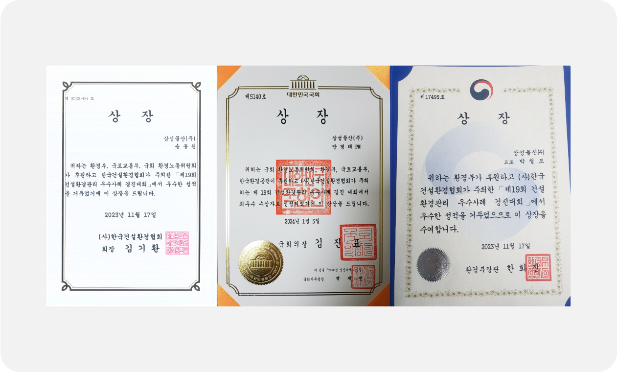 삼성물산 건설부문은 매년 한국건설환경협회가 주최하고 국회환경노동위원회, 환경부, 국토교통부가 후원하는 「건설환경관리 우수사례 경진대회」에서 우수한 성과를 얻고 있습니다. 건설공사 중 발생할 수 있는 환경 및 에너지 영향을 저감하기 위해 친환경 기술 및 공법을 적용하고, 환경오염의 억제 또는 차단을 위한 환경시설물을 강화하는 등 건설현장 환경관리 우수사례를 지속적으로 발굴하여 전파하고 있습니다.