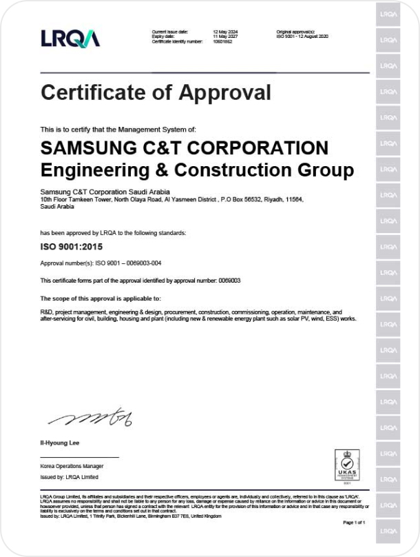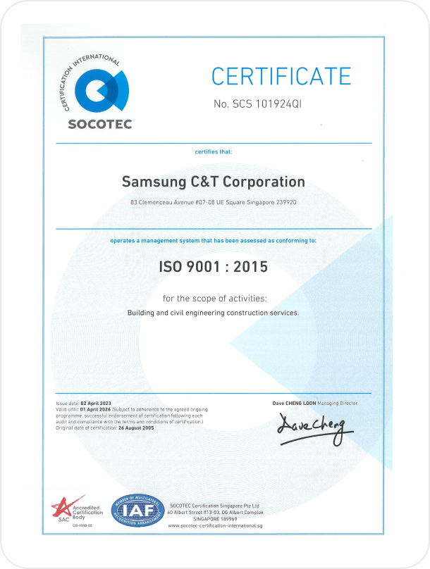 ISO 9001 인증서는 국제표준화기구(International Organization for Standardization)에서 발행한 규격(ISO 9000 Family)에 따라 품질경영시스템의 수립 및 이행상태를 공인된 인증기관이 심사하여 적합할 경우 발행하는 인증서입니다. 삼성물산 건설부문은 1994년 최초 인증을 취득한 후 3년 단위로 갱신하여 인증을 유지하고 있으며, 2024년 5월 인증 갱신을 완료하였습니다.