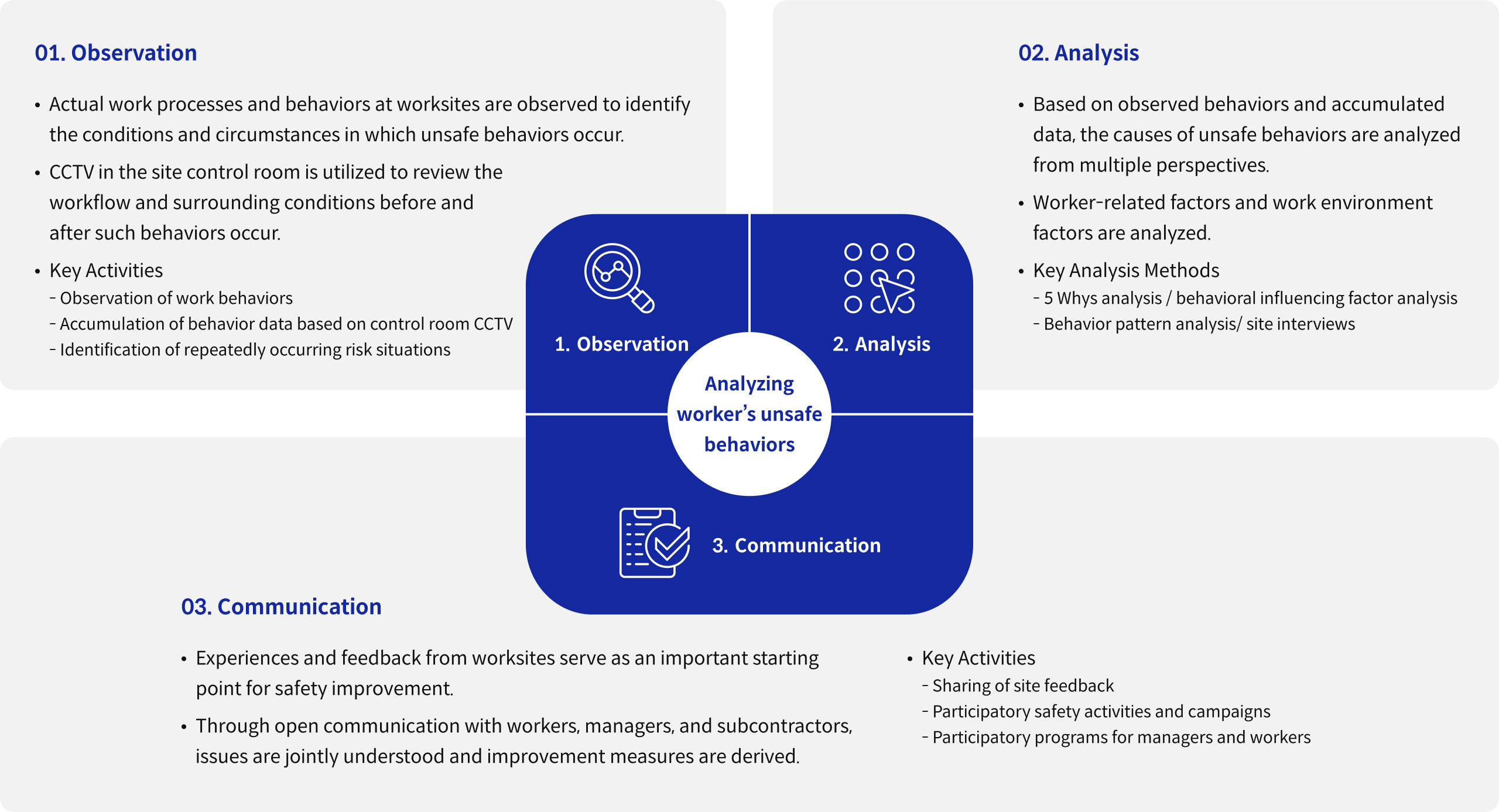 To establish the adaptation of safe behaviors, behavioral observation techniques are applied to systematically observe and identify unsafe actions occurring at worksites. The identified cases are then analyzed to determine root causes from various perspectives, including the work environment, systems, and awareness.