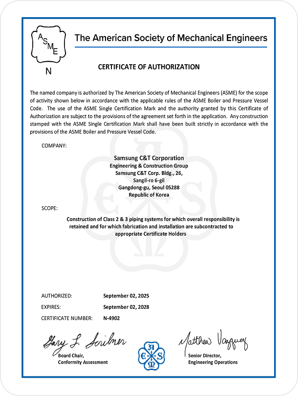 삼성물산 건설부문은 1991년 2월 최초로 인증을 취득하였으며, 3년마다 인증서 갱신을 통하여, NA(기기 설치), NPT(구성품 제작), N(2~3등급 배관시스템 설계) 분야 인증을 지속적으로 보유하고 있습니다.